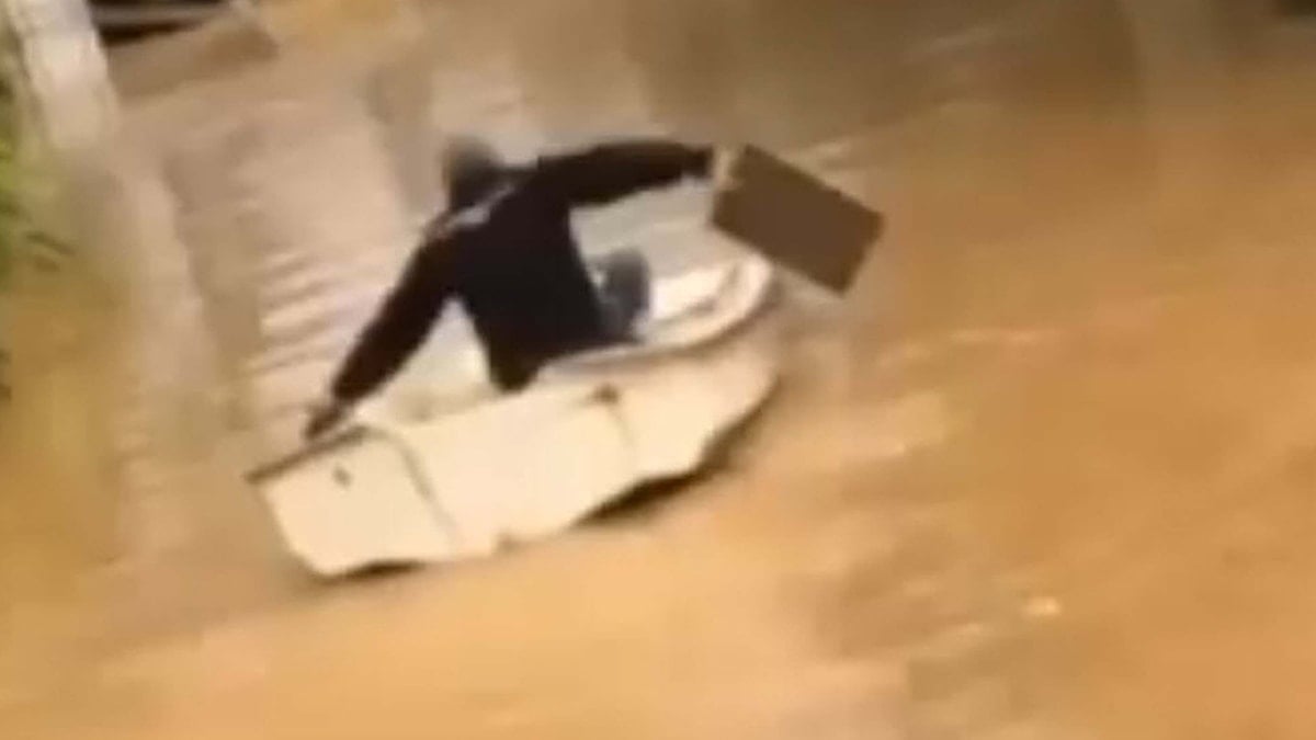 Bir vatandaşın suyla dolmuş bir caddede kayıkla ilerlemeye çalıştığı anlar, başka bir kişi tarafından cep telefonu kamerasıyla kaydedildi.