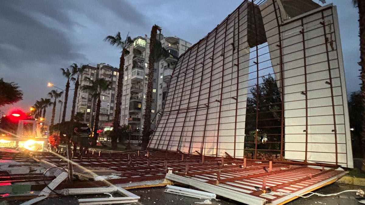 Kentte etkili olan sağanak, dolu ve güçlü rüzgar, birçok noktada hasara yol açtı. Yol kenarlarında ve parklarda bulunan ağaçlar devrildi, panolar yerinden çıktı. Yörükoğlu Kavşağı’nda bir binanın metal çatısı, dolu ve rüzgarın etkisiyle uçtu. Çatı, yol kenarındaki bir palmiye ağacına çarparak durdu. Güvenlik amacıyla yol trafiğe kapatıldı, olay yerine gelen itfaiye ekipleri, çatıyı kesici aletlerle parçalara ayırarak temizliği sağladı.