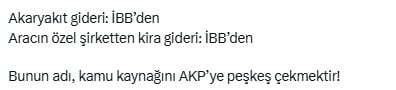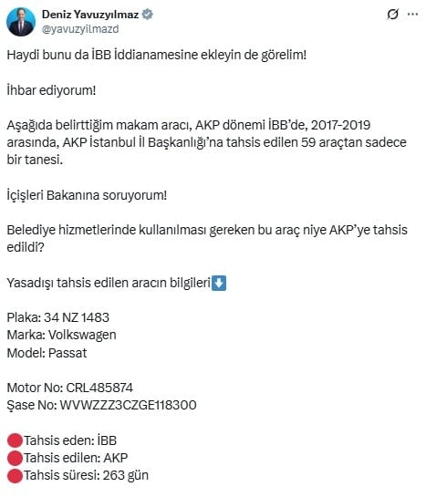 Aşağıda belirttiğim makam aracı, AKP döneminde İBB’ye ait 59 araçtan yalnızca bir tanesi. İçişleri Bakanı’na soruyorum: Belediye hizmetlerinde kullanılması gereken bu araç niye AKP’ye tahsis edildi?” ifadelerini kullandı.