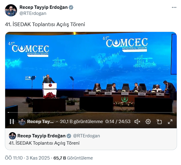 Bugün ayrıca Cumhurbaşkanı Erdoğan’ın resmi X hesabı üzerinden, 41. İSEDAK Toplantısı Açılış Töreni’nin canlı yayını paylaşıldı. 11.10’da yapılan paylaşım, 13.00 itibarıyla 65,7 bin görüntüleme aldı.