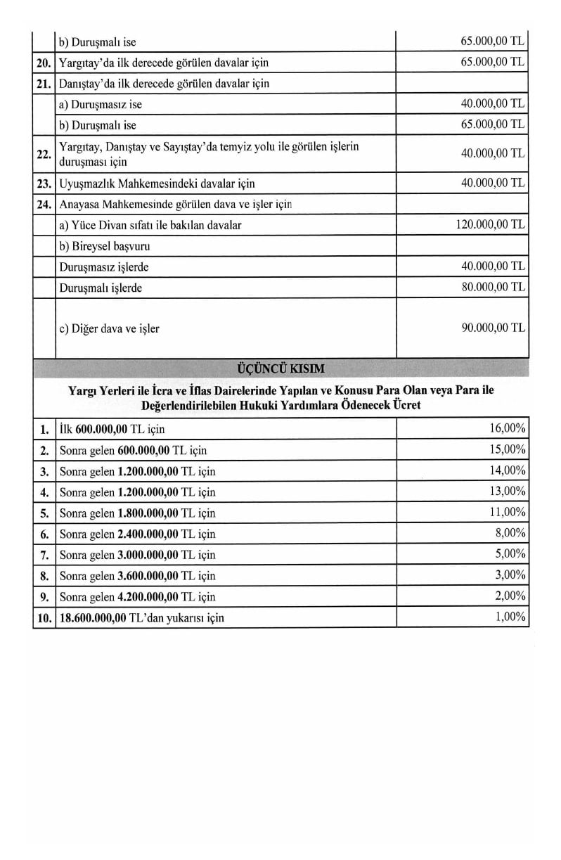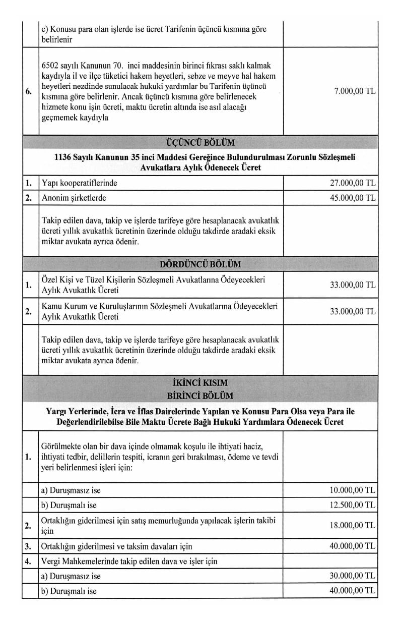 - Ayrıca, şirketlerde çalıştırılması zorunlu sözleşmeli avukatların alacağı aylık ücret 45 bin lira, yapı kooperatiflerinde görev yapan avukatların ücreti ise 27 bin liraya çıkarıldı.