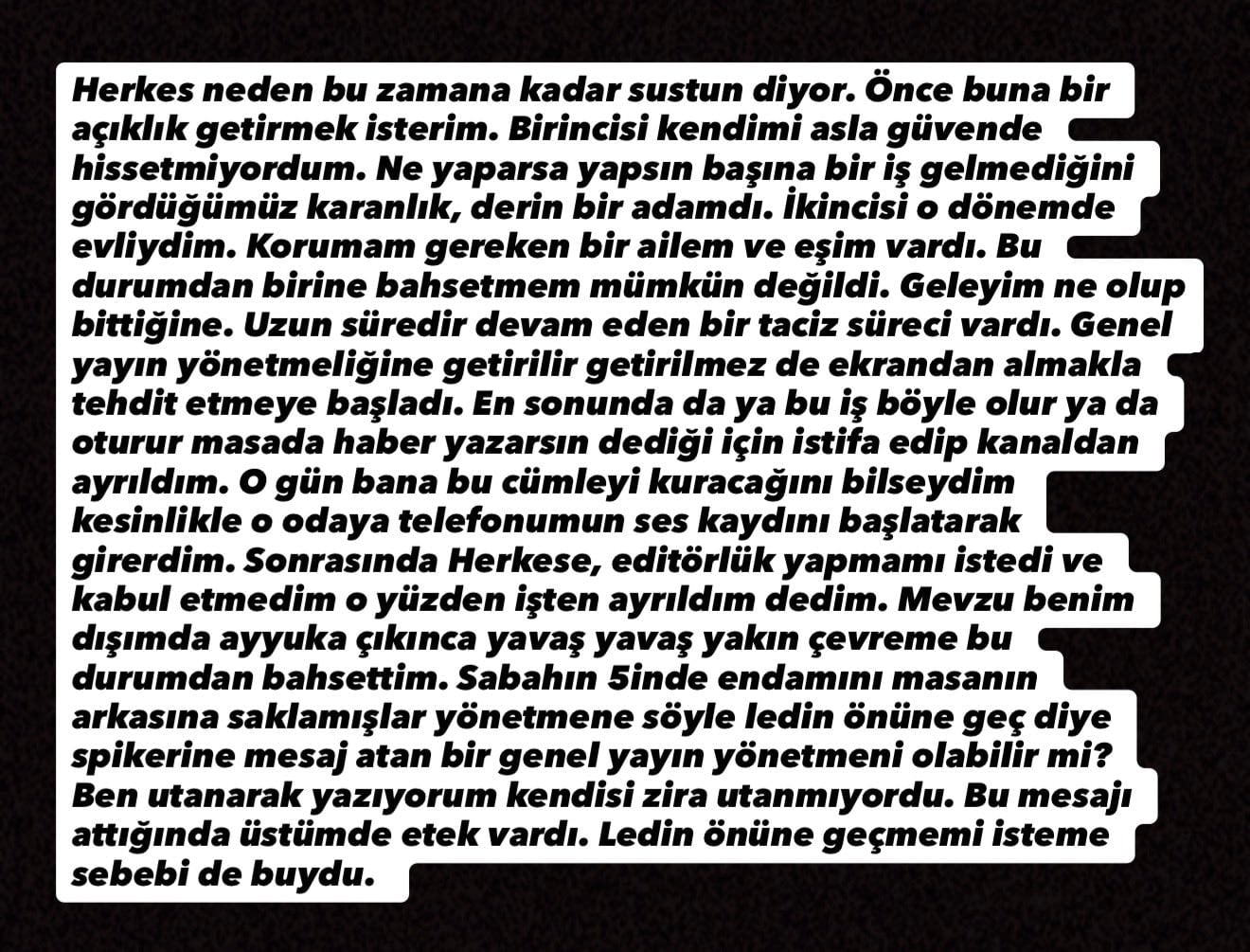 “Herkese Editörlük yapmamı istedi ve kabul etmediğim için işten ayrıldım” dedim. Olay benim dışımda açığa çıkınca, yavaş yavaş yakın çevreme bu durumu anlatmaya başladım. Sabahın 5’inde ‘Endamını masanın arkasına saklamışlar, yönetmene söyle LED’in önüne geç’ diye mesaj atan bir genel yayın yönetmeni olabilir mi? Ben utanarak yazıyorum, kendisi ise utanmıyordu. Bu mesajı attığında üstümde etek vardı ve LED’in önüne geçmemi istemesinin sebebi de buydu.”