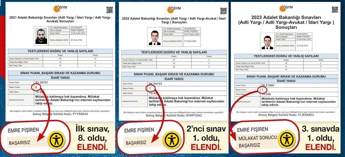 İdari hakim adayı Emre Pişiren, üç kez katıldığı idari hakimlik sınavında, 10 bini aşkın kişi arasında ilk sınavda Türkiye 8’incisi, sonraki iki sınavda ise Türkiye birincisi olmayı başardı. Ankara Üniversitesi Siyasal Bilgiler Fakültesi mezunu olan Pişiren, hayalini kurduğu hâkimlik mesleğinde mülakat aşamasında karşılaştığı engellerle ilgili olarak, “Mülakatta elendim ve büyük bir hayal kırıklığı yaşadım” dedi.