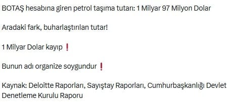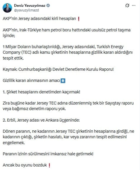 CHP’nin Kamu Yönetimi ve Yolsuzluklarla Mücadele Birimi Başkanı Deniz Yavuzyılmaz, sosyal medya üzerinden yaptığı açıklamada, AKP’nin Irak-Türkiye ham petrol boru hattında usulsüz petrol taşımacılığıyla ilgili bir kamu şirketinin hesaplarına gizlilik kararı aldırdığını duyurdu.