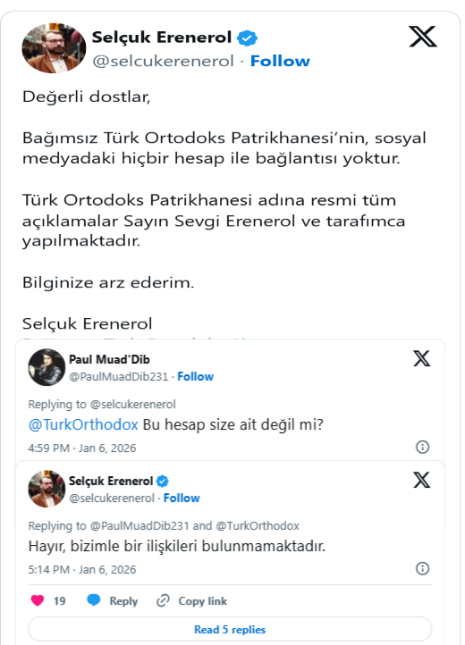 Bağımsız Türk Ortodoks Patrikhanesi’nin Sözcüsü Selçuk Erenerol ise bu oluşumun kendileriyle herhangi bir ilgisi olmadığını bildirdi.