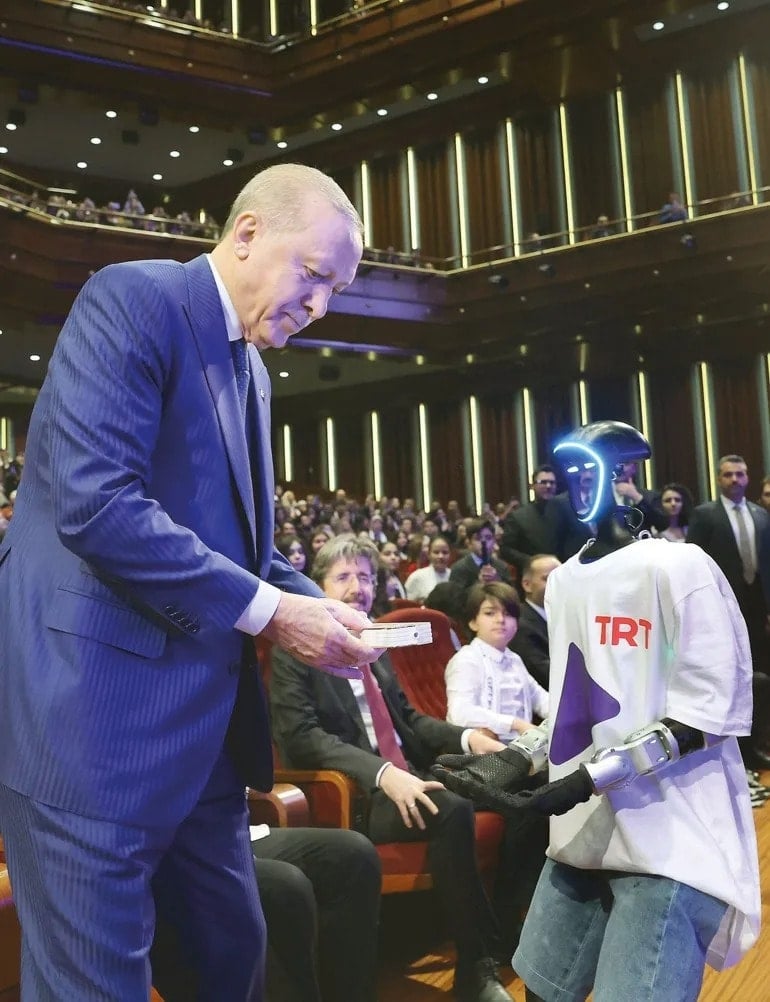 Cumhurbaşkanı Erdoğan, Beştepe’de TRT Genç Kanalı Açılış Etkinliği’nde, Türk mühendisler tarafından üretildiği iddia edilen ‘Robogenç’ isimli robottan kumanda aldı.