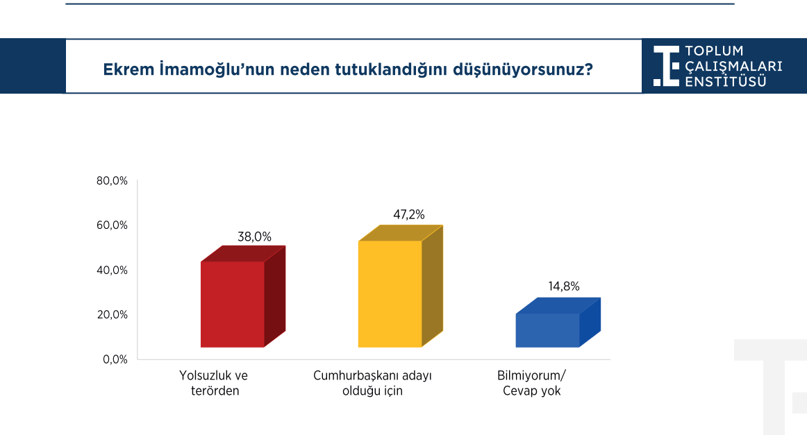 Araştırma sonuçlarına göre, erken seçim talep edenlerin oranı yüzde 52 olarak kaydedildi. Ayrıca, CHP’nin cumhurbaşkanı adayı olan ve görevden alınan Türkiye Belediyeler Birliği ile İstanbul Büyükşehir Belediye Başkanı Ekrem İmamoğlu’nun tutuklanması, katılımcıların büyük çoğunluğu tarafından “siyasi” bir gelişme olarak değerlendirildi.