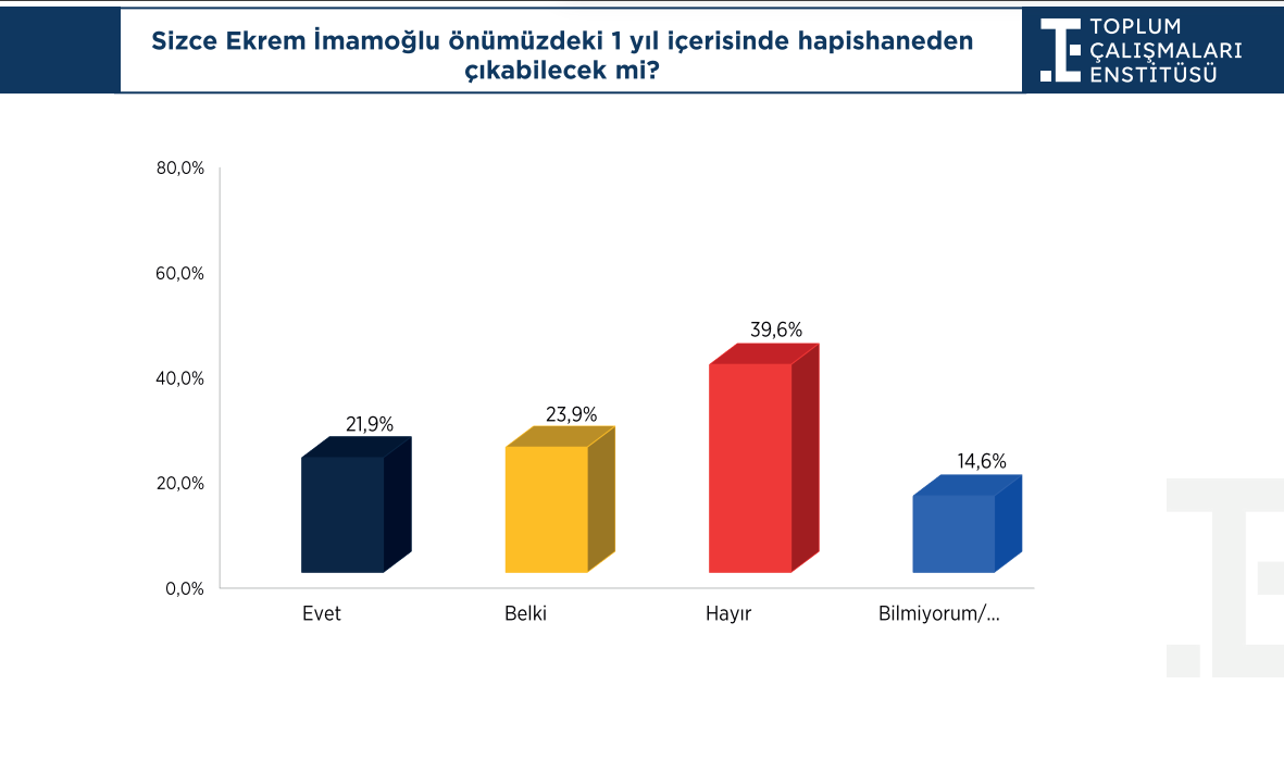 Ekrem İmamoğlu’nun “önümüzdeki bir yıl içerisinde hapishaneden çıkabilecek mi?” sorusuna verilen yanıtlar ise şu şekilde dağıldı: yüzde 39.6 “hayır”, yüzde 21.9 “evet”, yüzde 23.9 “belki” ve yüzde 14.6 “bilmiyorum”.